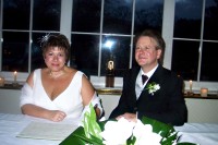 We got married at 4 pm, just as it was going dark. Here we are 'signing the register' at the end of the ceremony. The room was candlelit , as you can see behind us. The accompanying music was by Nhoque, who we heard perform in Hanoi on a trip to Vietnam in 2002. |