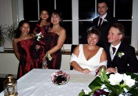 | Everyone in on the act! We are joined by the bridesmaids Aimie and Alix, maid of honour Diane, and the best man Bernie, The lovely table flowers were organised by the Pavillion Gardens in compensation for trying to drop lumps of metal on our head. |